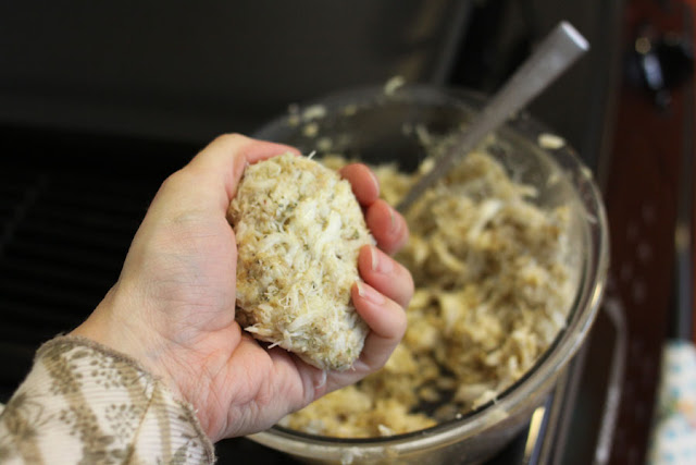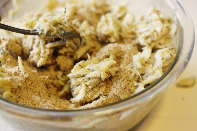 Fold in the 1/2 cup of bread crumbs to the crab mixture.