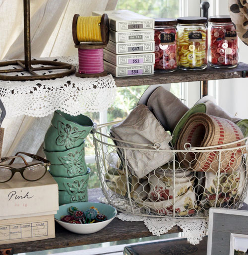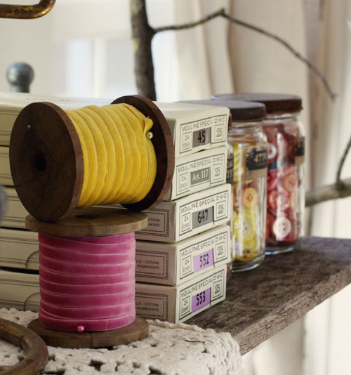 So beautiful!! I too would love to know the paint color. I was sure you had already told us at some point but I cant find it. Also where did you find the gorgeous ribbon on the spools and the button jars! I love your style!!!