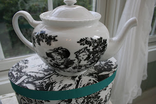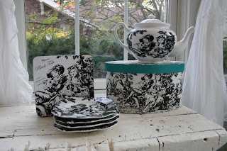 I have 2 teapots in the Black and White toile that were originally $30 and now for you $10! They come all packaged in a sweet box! I also have 4 sets of appi plates (4 in a box) that were also $30 originally, and now $10 per box. ONE TEAPOT & TWO PLATE SETS LEFT